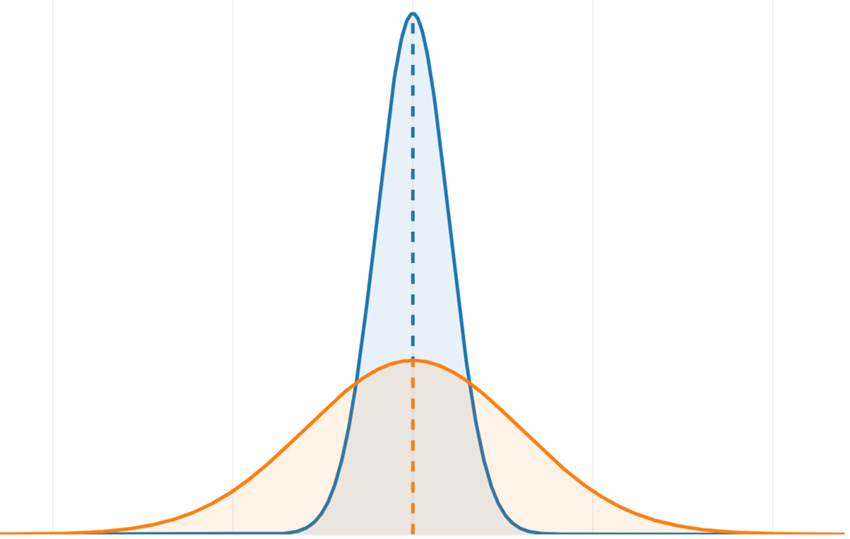 Figure 2.7.1 The orange distribution has a much higher variance than the blue distribution.
